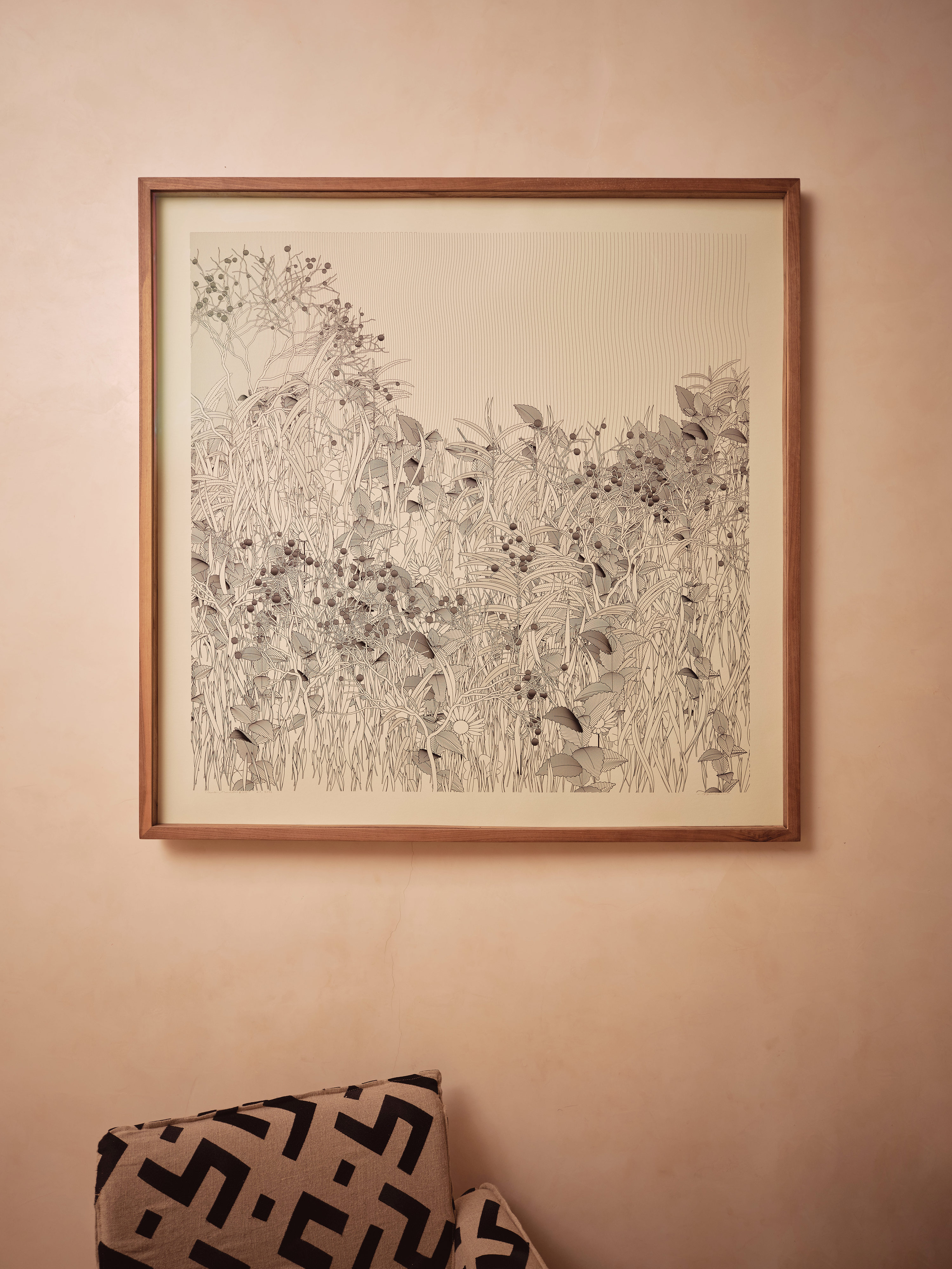 The initial goal was to use mathematical formulas for creating patterns inspired by the density of nature, that could be used by a pen plotter, so it kept focusing on outputting vector lines. This history and practice produced a graphical style based on line strokes, plus occasionally some transparent, filled shapes.