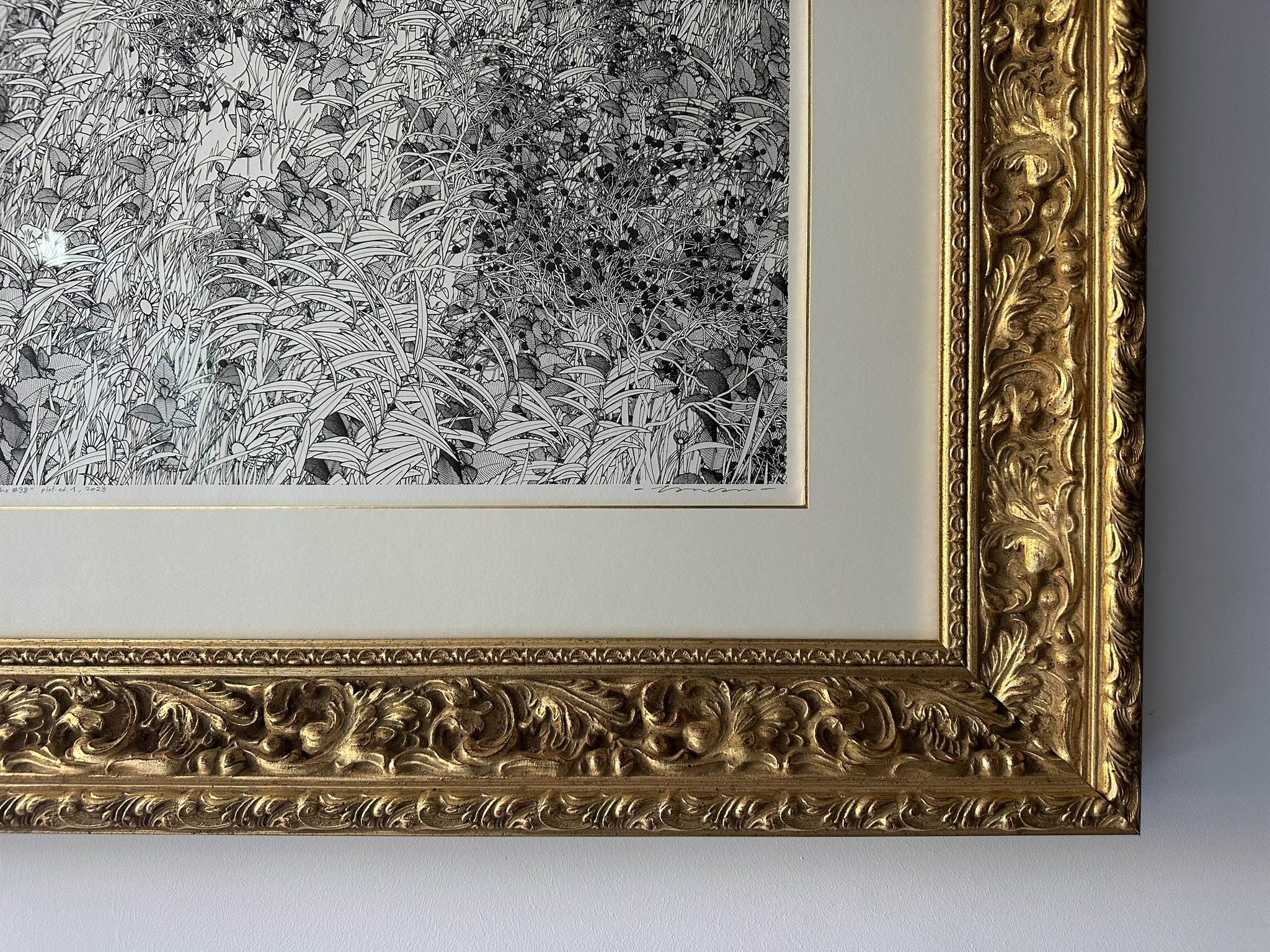 The initial goal was to use mathematical formulas for creating patterns inspired by the density of nature, that could be used by a pen plotter, so it kept focusing on outputting vector lines. This history and practice produced a graphical style based on line strokes, plus occasionally some transparent, filled shapes.