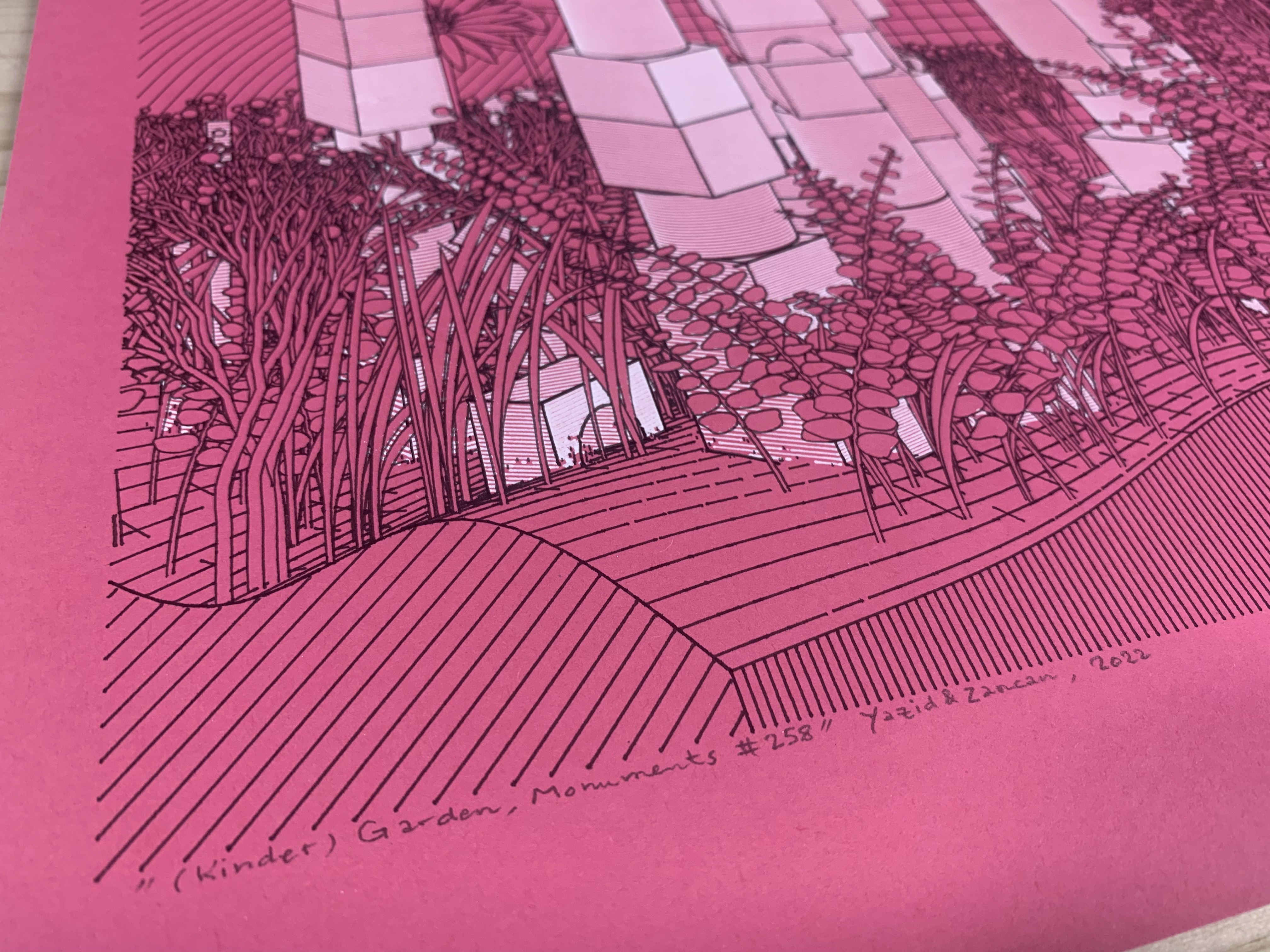 Coded in Vanilla JS, the project combines Yazid's iconic “Hashed/Hatched” aesthetic incorporated into childhood wooden toy block structures, and Zancan's signature lush foliage and framework, which enables all iterations to be plottable.