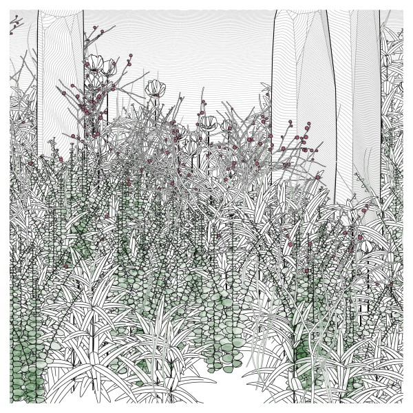 The initial goal was to use mathematical formulas for creating patterns inspired by the density of nature, that could be used by a pen plotter, so it kept focusing on outputting vector lines. This history and practice produced a graphical style based on line strokes, plus occasionally some transparent, filled shapes.