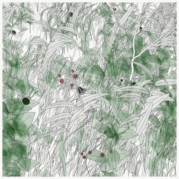 The initial goal was to use mathematical formulas for creating patterns inspired by the density of nature, that could be used by a pen plotter, so it kept focusing on outputting vector lines. This history and practice produced a graphical style based on line strokes, plus occasionally some transparent, filled shapes.