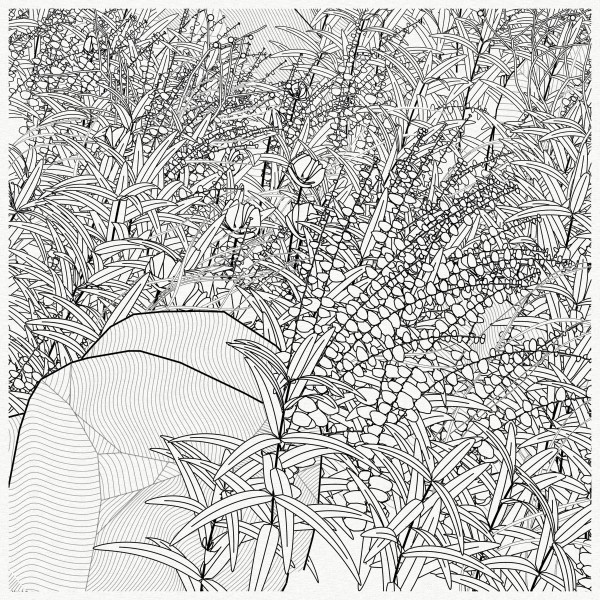 The initial goal was to use mathematical formulas for creating patterns inspired by the density of nature, that could be used by a pen plotter, so it kept focusing on outputting vector lines. This history and practice produced a graphical style based on line strokes, plus occasionally some transparent, filled shapes.