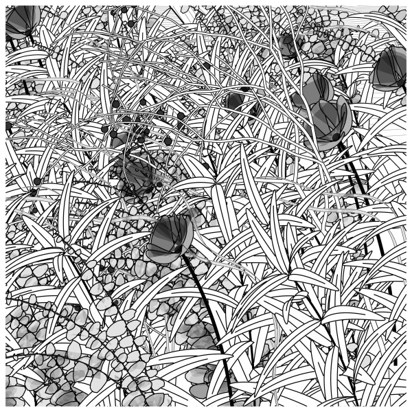 The initial goal was to use mathematical formulas for creating patterns inspired by the density of nature, that could be used by a pen plotter, so it kept focusing on outputting vector lines. This history and practice produced a graphical style based on line strokes, plus occasionally some transparent, filled shapes.
