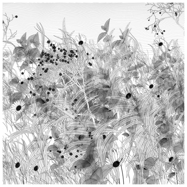 The initial goal was to use mathematical formulas for creating patterns inspired by the density of nature, that could be used by a pen plotter, so it kept focusing on outputting vector lines. This history and practice produced a graphical style based on line strokes, plus occasionally some transparent, filled shapes.