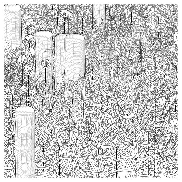 The initial goal was to use mathematical formulas for creating patterns inspired by the density of nature, that could be used by a pen plotter, so it kept focusing on outputting vector lines. This history and practice produced a graphical style based on line strokes, plus occasionally some transparent, filled shapes.