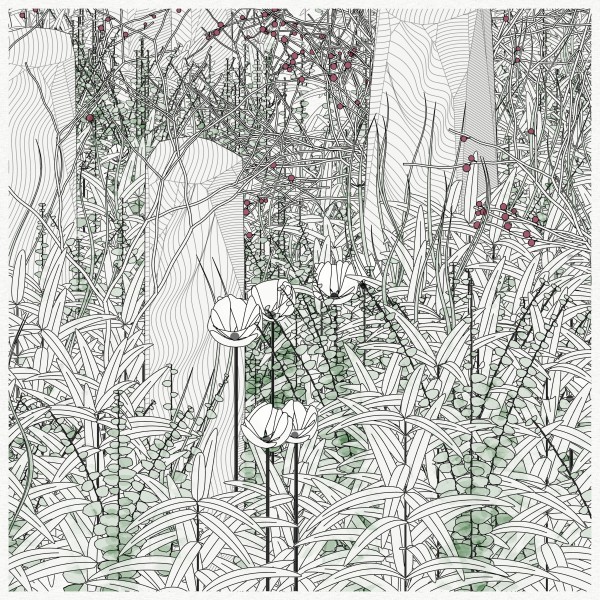 The initial goal was to use mathematical formulas for creating patterns inspired by the density of nature, that could be used by a pen plotter, so it kept focusing on outputting vector lines. This history and practice produced a graphical style based on line strokes, plus occasionally some transparent, filled shapes.