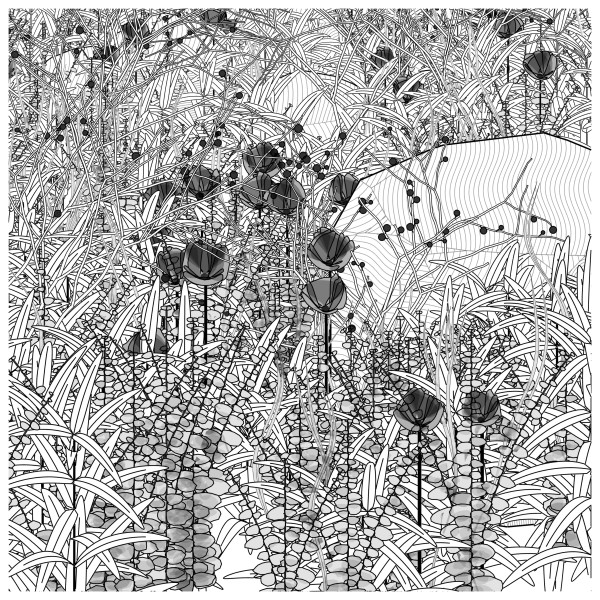 The initial goal was to use mathematical formulas for creating patterns inspired by the density of nature, that could be used by a pen plotter, so it kept focusing on outputting vector lines. This history and practice produced a graphical style based on line strokes, plus occasionally some transparent, filled shapes.