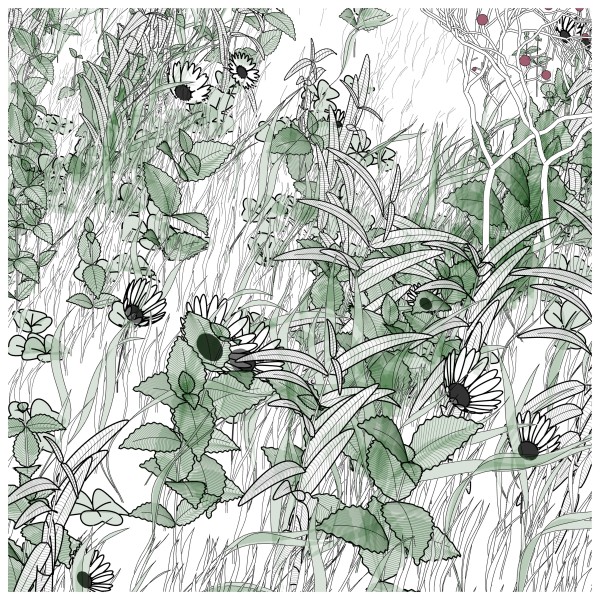 The initial goal was to use mathematical formulas for creating patterns inspired by the density of nature, that could be used by a pen plotter, so it kept focusing on outputting vector lines. This history and practice produced a graphical style based on line strokes, plus occasionally some transparent, filled shapes.