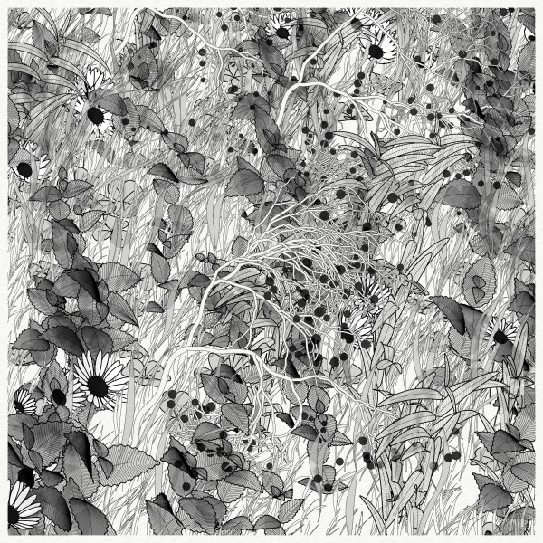 The initial goal was to use mathematical formulas for creating patterns inspired by the density of nature, that could be used by a pen plotter, so it kept focusing on outputting vector lines. This history and practice produced a graphical style based on line strokes, plus occasionally some transparent, filled shapes.
