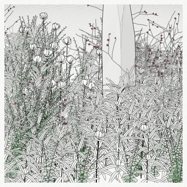 The initial goal was to use mathematical formulas for creating patterns inspired by the density of nature, that could be used by a pen plotter, so it kept focusing on outputting vector lines. This history and practice produced a graphical style based on line strokes, plus occasionally some transparent, filled shapes.