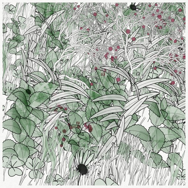 The initial goal was to use mathematical formulas for creating patterns inspired by the density of nature, that could be used by a pen plotter, so it kept focusing on outputting vector lines. This history and practice produced a graphical style based on line strokes, plus occasionally some transparent, filled shapes.