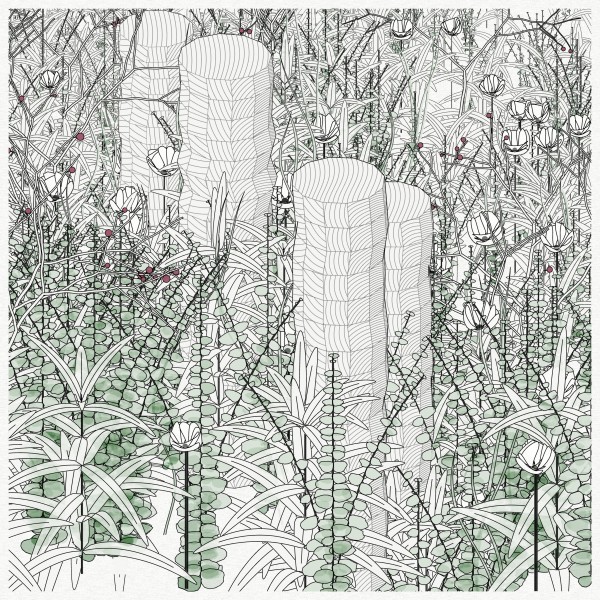 The initial goal was to use mathematical formulas for creating patterns inspired by the density of nature, that could be used by a pen plotter, so it kept focusing on outputting vector lines. This history and practice produced a graphical style based on line strokes, plus occasionally some transparent, filled shapes.