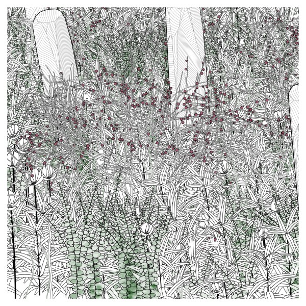 The initial goal was to use mathematical formulas for creating patterns inspired by the density of nature, that could be used by a pen plotter, so it kept focusing on outputting vector lines. This history and practice produced a graphical style based on line strokes, plus occasionally some transparent, filled shapes.