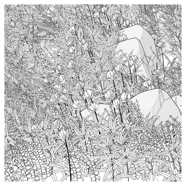 The initial goal was to use mathematical formulas for creating patterns inspired by the density of nature, that could be used by a pen plotter, so it kept focusing on outputting vector lines. This history and practice produced a graphical style based on line strokes, plus occasionally some transparent, filled shapes.