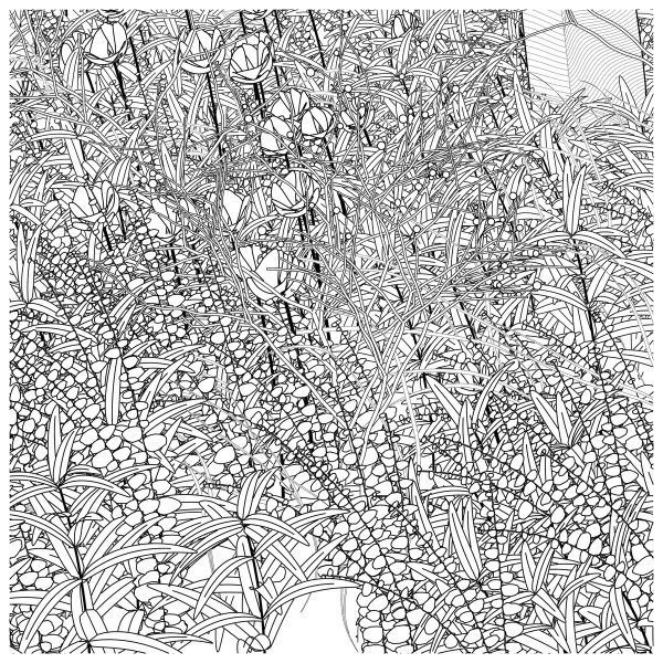 The initial goal was to use mathematical formulas for creating patterns inspired by the density of nature, that could be used by a pen plotter, so it kept focusing on outputting vector lines. This history and practice produced a graphical style based on line strokes, plus occasionally some transparent, filled shapes.