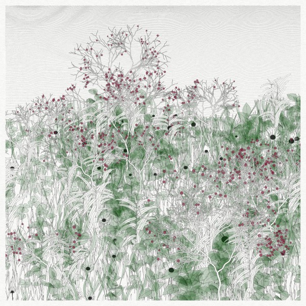 The initial goal was to use mathematical formulas for creating patterns inspired by the density of nature, that could be used by a pen plotter, so it kept focusing on outputting vector lines. This history and practice produced a graphical style based on line strokes, plus occasionally some transparent, filled shapes.