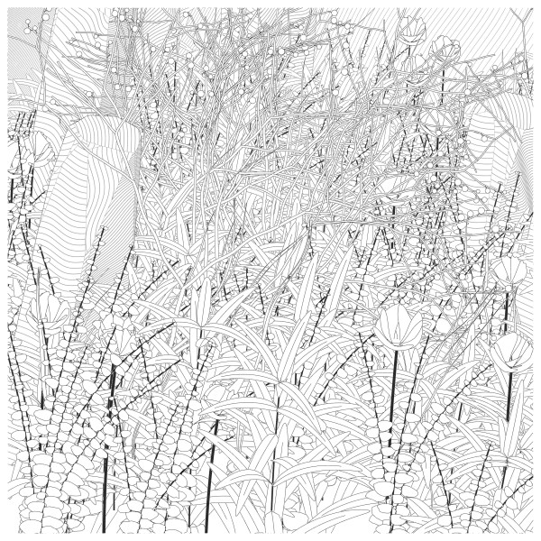 The initial goal was to use mathematical formulas for creating patterns inspired by the density of nature, that could be used by a pen plotter, so it kept focusing on outputting vector lines. This history and practice produced a graphical style based on line strokes, plus occasionally some transparent, filled shapes.