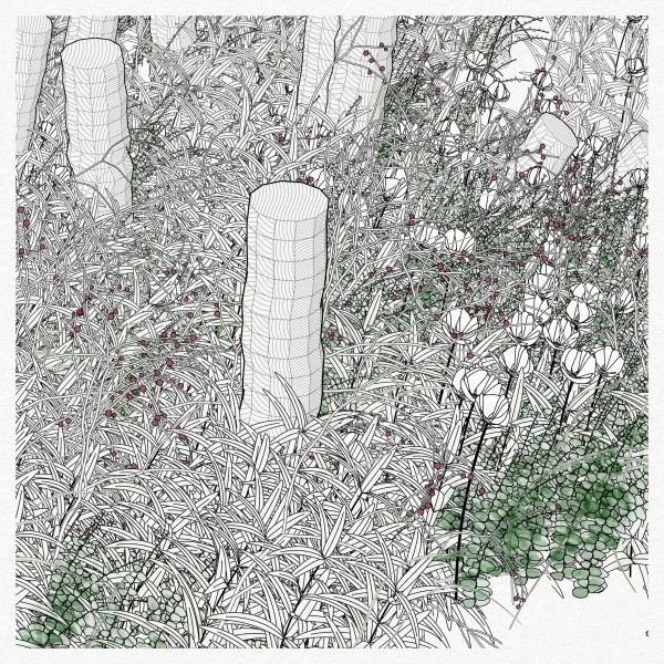 The initial goal was to use mathematical formulas for creating patterns inspired by the density of nature, that could be used by a pen plotter, so it kept focusing on outputting vector lines. This history and practice produced a graphical style based on line strokes, plus occasionally some transparent, filled shapes.