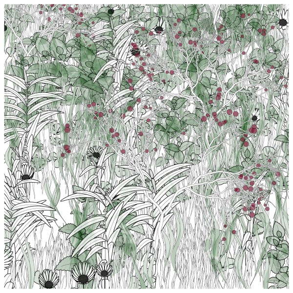 The initial goal was to use mathematical formulas for creating patterns inspired by the density of nature, that could be used by a pen plotter, so it kept focusing on outputting vector lines. This history and practice produced a graphical style based on line strokes, plus occasionally some transparent, filled shapes.