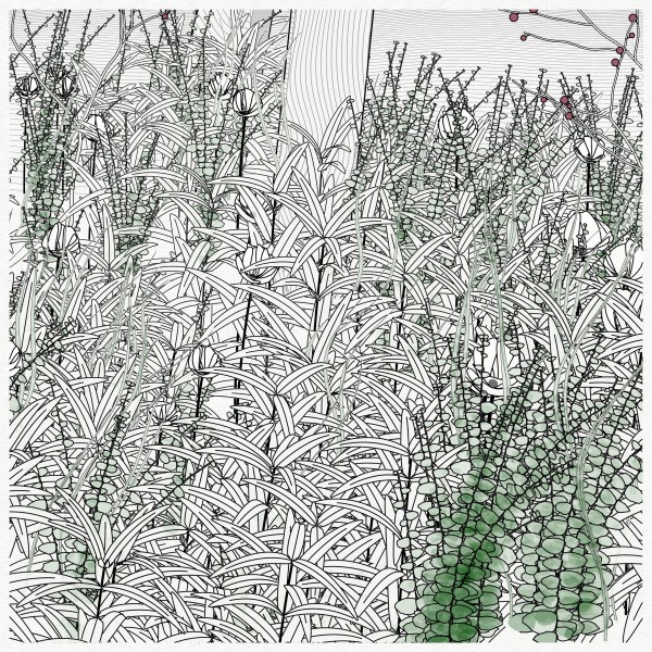 The initial goal was to use mathematical formulas for creating patterns inspired by the density of nature, that could be used by a pen plotter, so it kept focusing on outputting vector lines. This history and practice produced a graphical style based on line strokes, plus occasionally some transparent, filled shapes.
