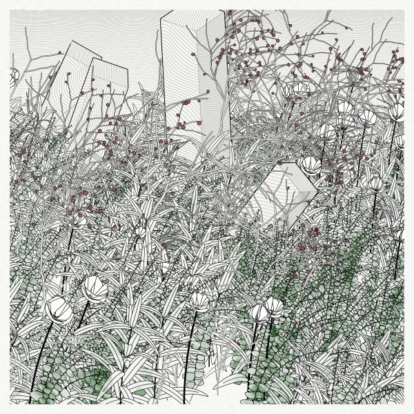 The initial goal was to use mathematical formulas for creating patterns inspired by the density of nature, that could be used by a pen plotter, so it kept focusing on outputting vector lines. This history and practice produced a graphical style based on line strokes, plus occasionally some transparent, filled shapes.