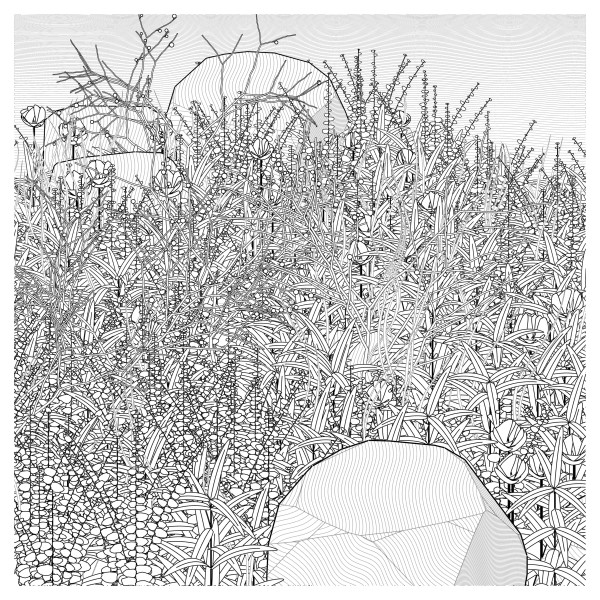 The initial goal was to use mathematical formulas for creating patterns inspired by the density of nature, that could be used by a pen plotter, so it kept focusing on outputting vector lines. This history and practice produced a graphical style based on line strokes, plus occasionally some transparent, filled shapes.