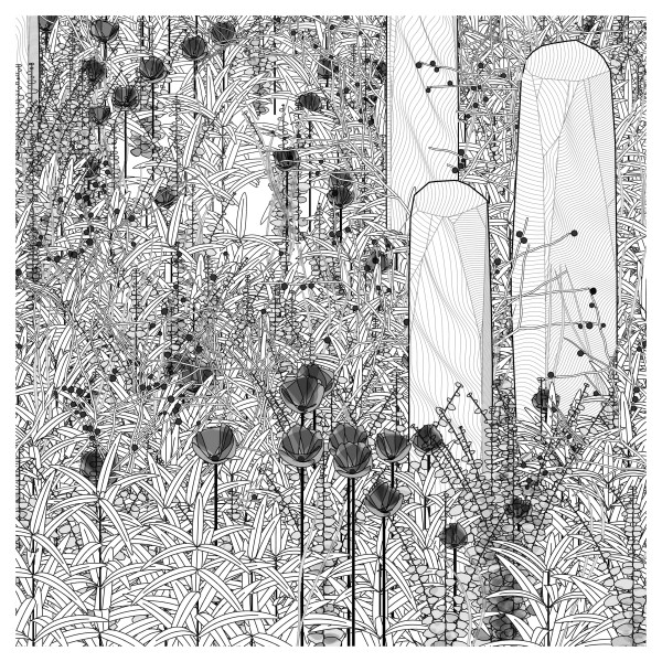 The initial goal was to use mathematical formulas for creating patterns inspired by the density of nature, that could be used by a pen plotter, so it kept focusing on outputting vector lines. This history and practice produced a graphical style based on line strokes, plus occasionally some transparent, filled shapes.