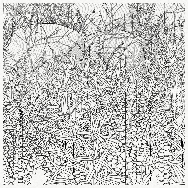 The initial goal was to use mathematical formulas for creating patterns inspired by the density of nature, that could be used by a pen plotter, so it kept focusing on outputting vector lines. This history and practice produced a graphical style based on line strokes, plus occasionally some transparent, filled shapes.