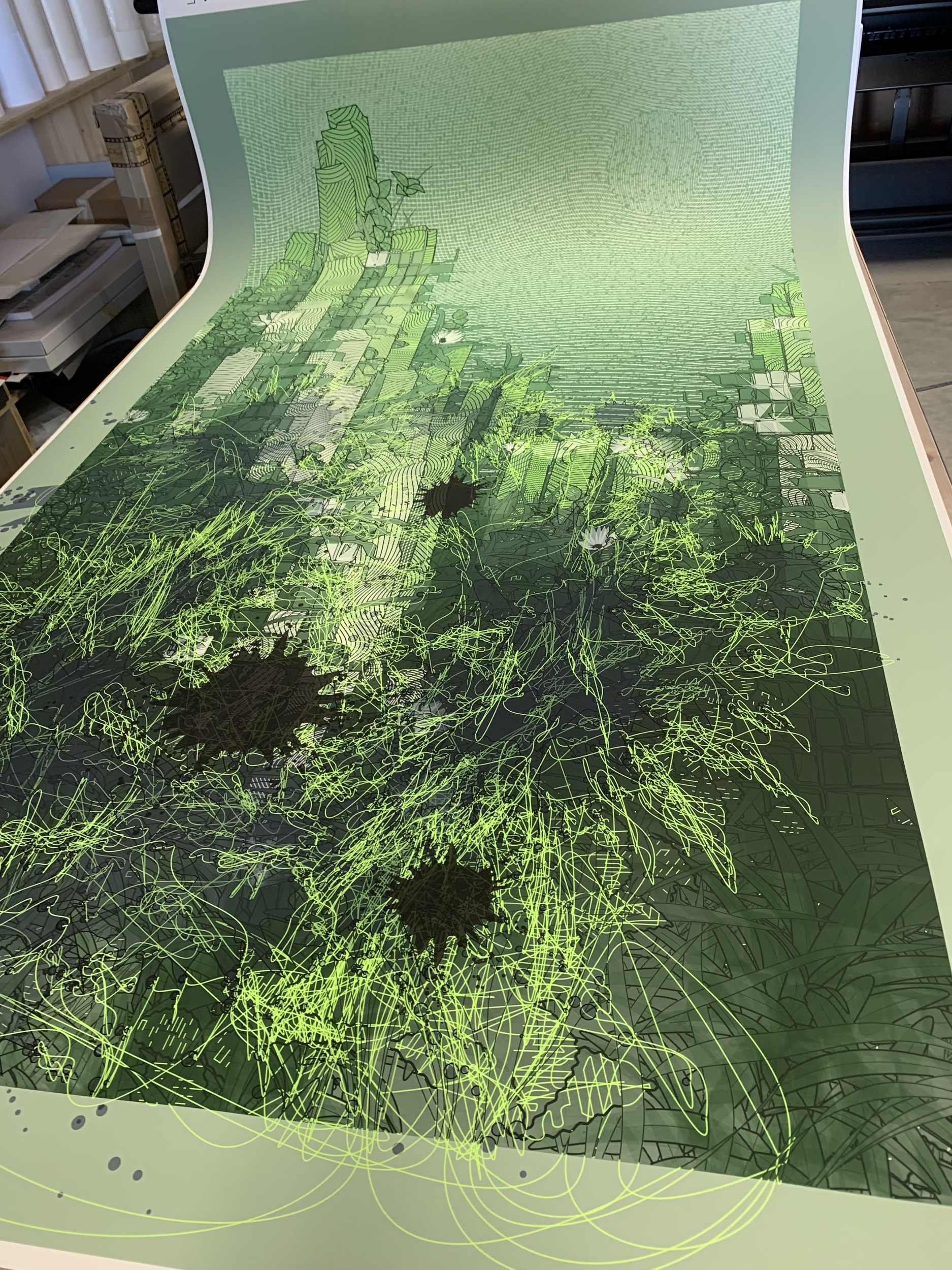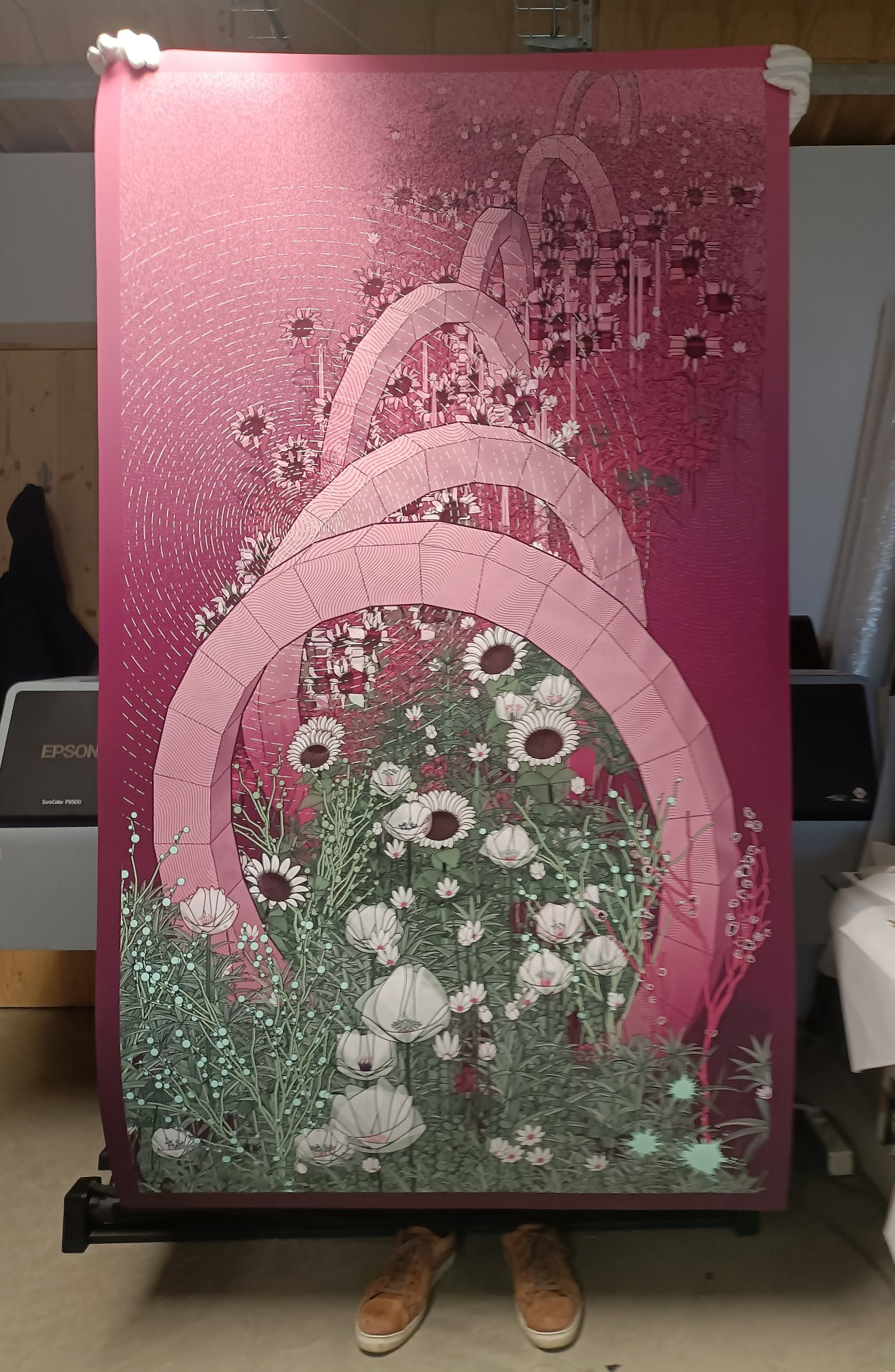 Two 300 dpi bombs from the print workshop today, “Post-Garden Pop Drama” (will be on view in Paris next week) ( went straight to the framer) and a dazzling 1m x 1m “Skyscraper” shipping to US.