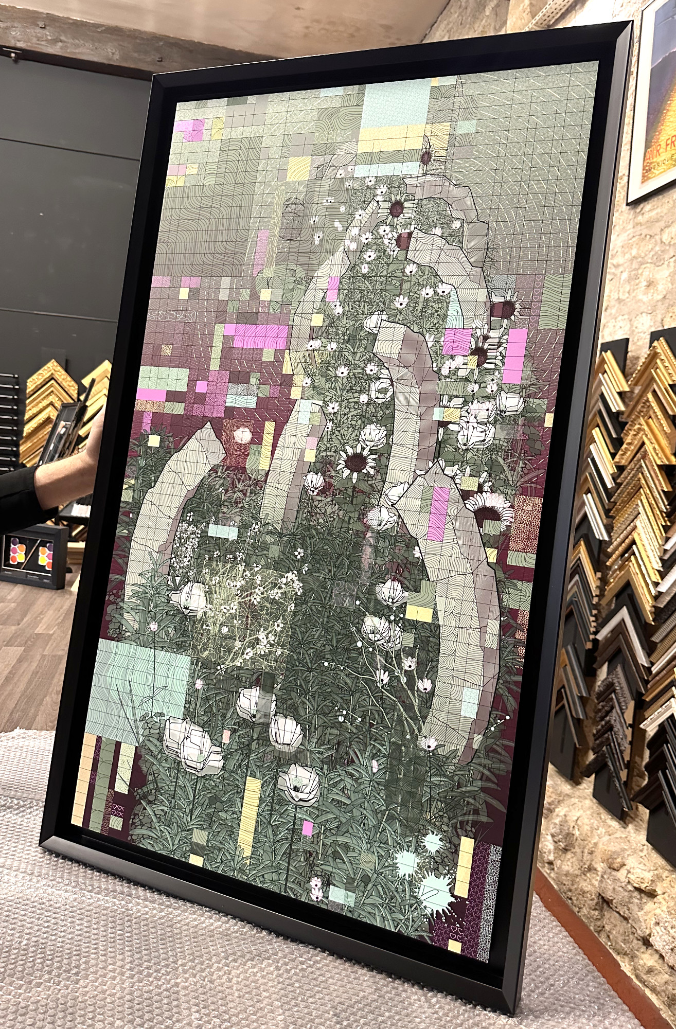 ’s "Post-Garden Pop Drama" integrates personal symbols. The grid symbolizes digital space, intertwining with figurative & abstract elements. This piece mirrors the artist's journey & the broader digital art realm.