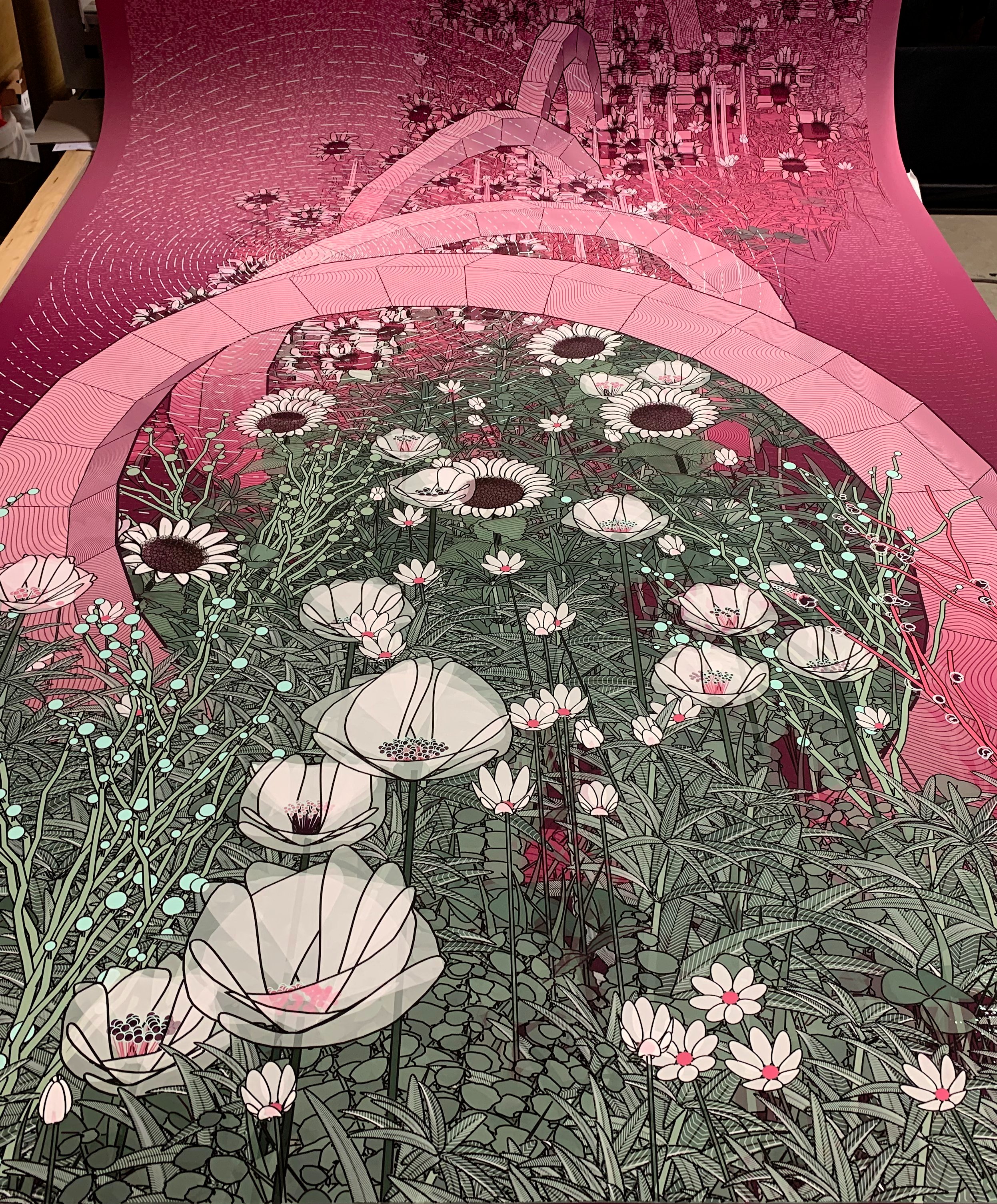 Against a pink background, a somewhat iconic scheme in my body of work, the bluish splatters are #C0FFEE stains, a digital transposition of an incident well known to traditional artists, and a nod to the drink that helped me through the sleepless nights of my own artistic transition.