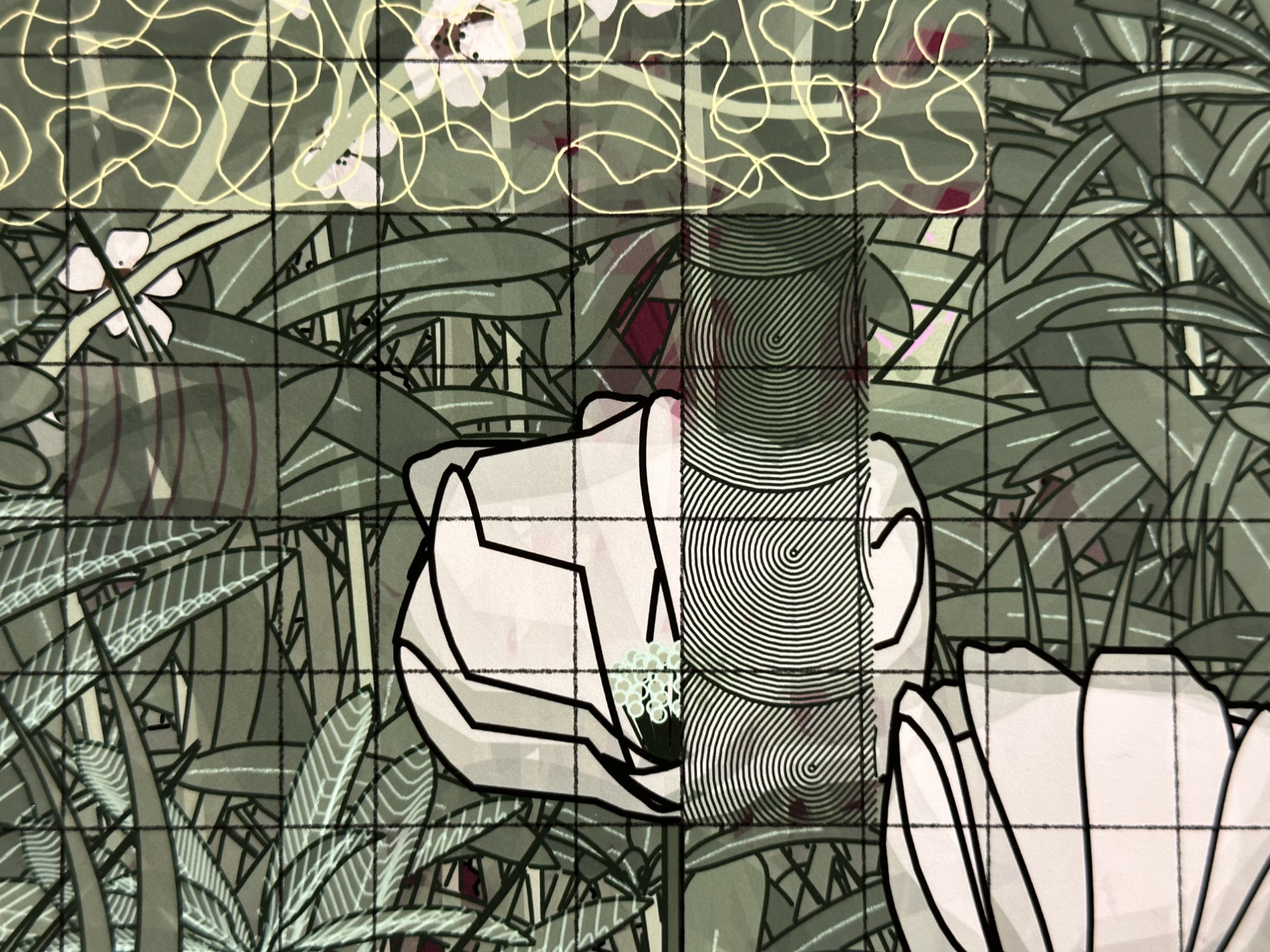 This piece, as is customary for me, is laden with personal symbolism, often abstract. Mingled with the figurative composition, the myriad of small squares serve as nods to certain of my works or to lived moments from my journey as a digital artist. The grid construction, symbolizing digital space, intertwines with perspective to the point where distinguishing foreground from background becomes difficult, or whether one is faced with a figurative or abstract work. Yet, this interweaving suggests a balance, that of the "whole" to which I belong and which is a part of me.