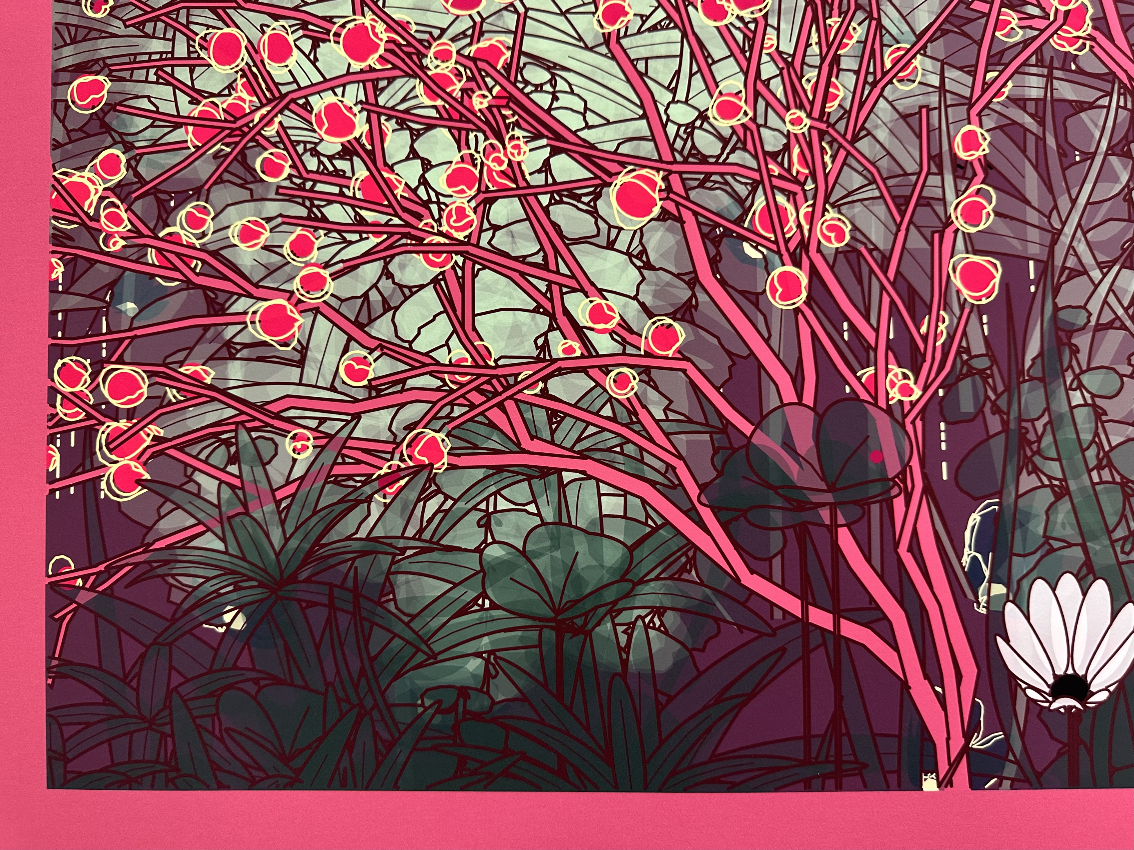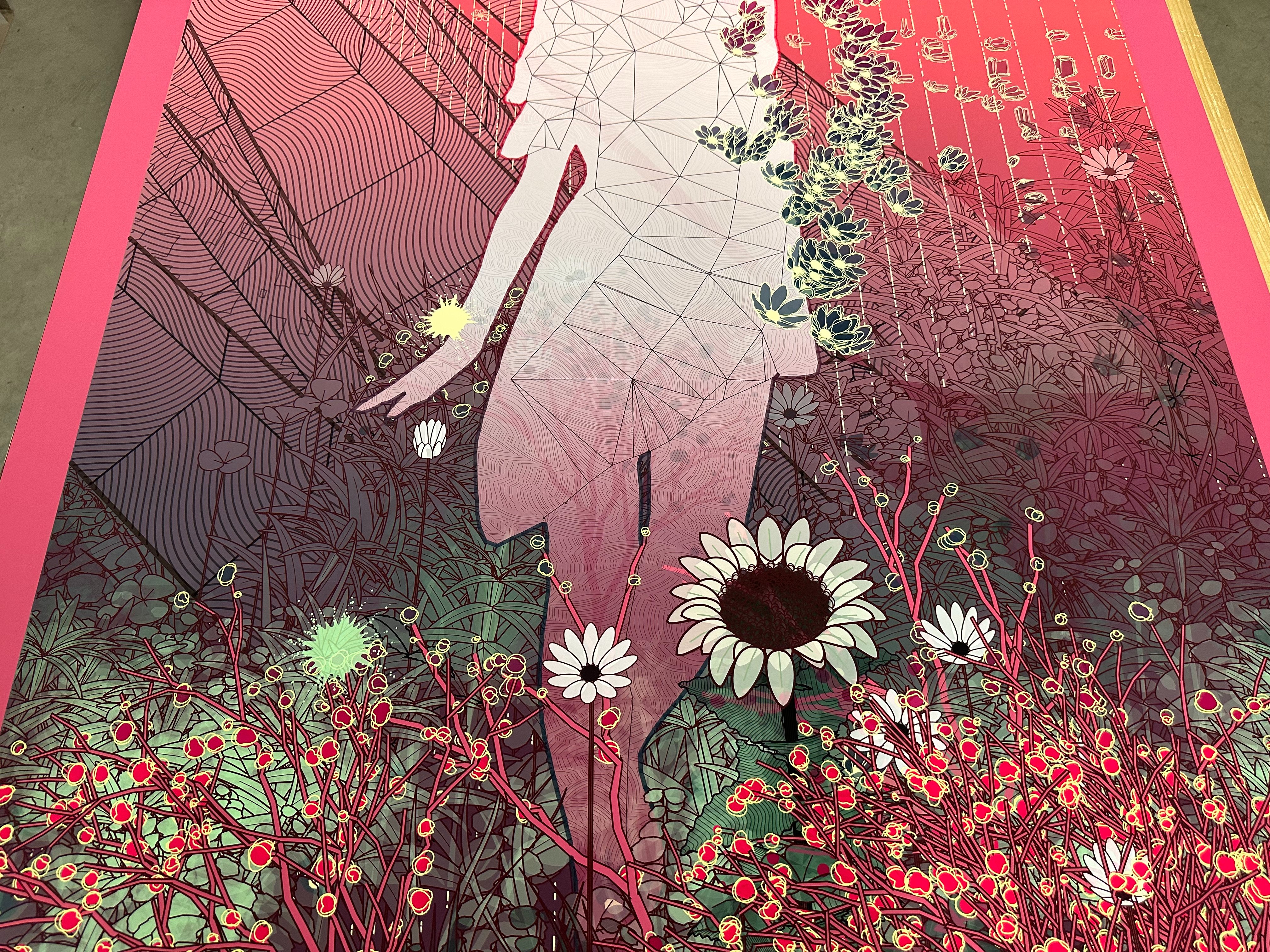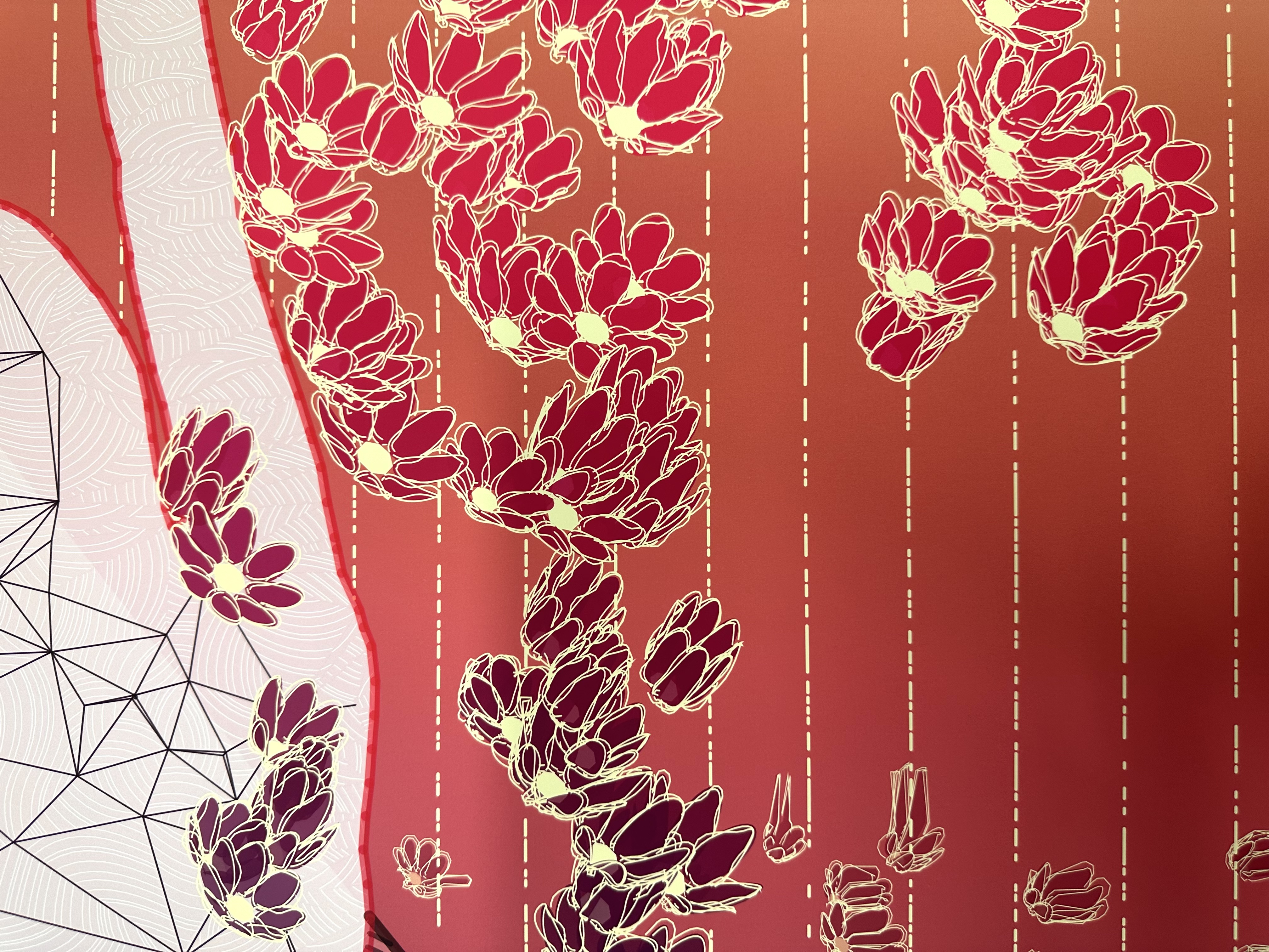 Following the principle of his work "The (re)Birth of Venus", Zancan fed his algorithms with Aleksandra’s silhouette. Through code, “Moving Towers to Catch a Sunset in New York” generates abstract or organic patterns that mimic the shapes and forms found in nature. The central focus of the work is an abstract shape of a woman with raised hands that creates a sense of oneness between the feminine form and the environment, highlighting the interconnectedness of all living things. The gradients and blooming flowers add a luminous quality to the piece, suggesting a radiant and powerful energy emanating from the feminine figure, a life-giving force reminiscent of nature itself.