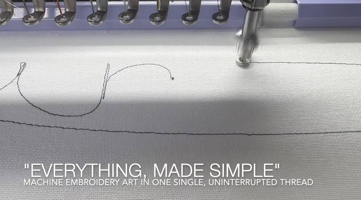 This particular piece, which originally exists as a digital NFT, has been plotted on paper multiple times. However, this stitched version is a unique artifact: executed in inverted colors—black on white rather than the original white on black—converted into embroidery machine file format using the artist’s custom generative process, and produced on the artist’s own embroidery machine. The work comprises a total of 90,147 stitches. This singular execution required a reworking of the original algorithm to allow for varying stroke widths while preserving the integrity of a continuous, single-thread process.