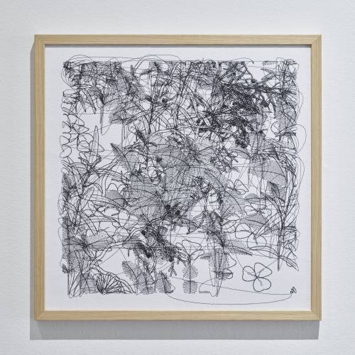 A Long Thread and Everything Made Simple are companion works that carry out the motif of the continuous line, stitched into fabric in a quiet tribute to pioneering media artist Herbert W. Franke. These lines become a symbol of connection, continuity, and the unpredictability that lies at the heart of both nature and code. Proceeds from both works were donated to the Foundation Herbert W. Franke, with a focus on funding the digitization of his manuscripts.